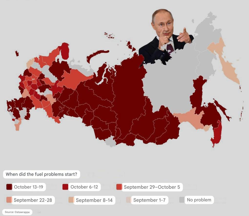 84% of regions: fuel shortages. Prices soar. Queues stretch for miles.