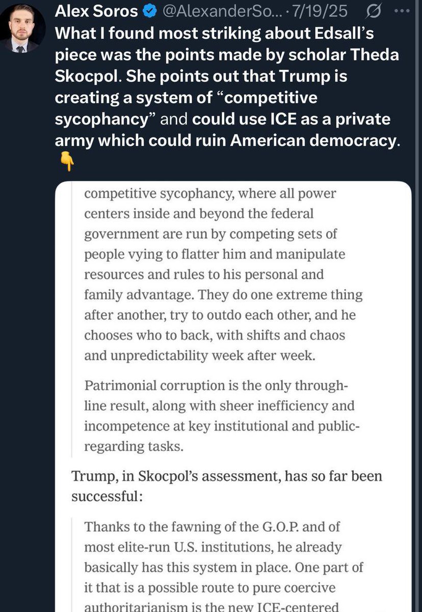According to FEC records, Alex Soros donated to Cooper’s reelection campaign for Governor in 2019. Alex Soros recently shared a post falsely and ridiculously accusing President Trump of using ICE as his personal “private army” force to “ruin” American democracy.