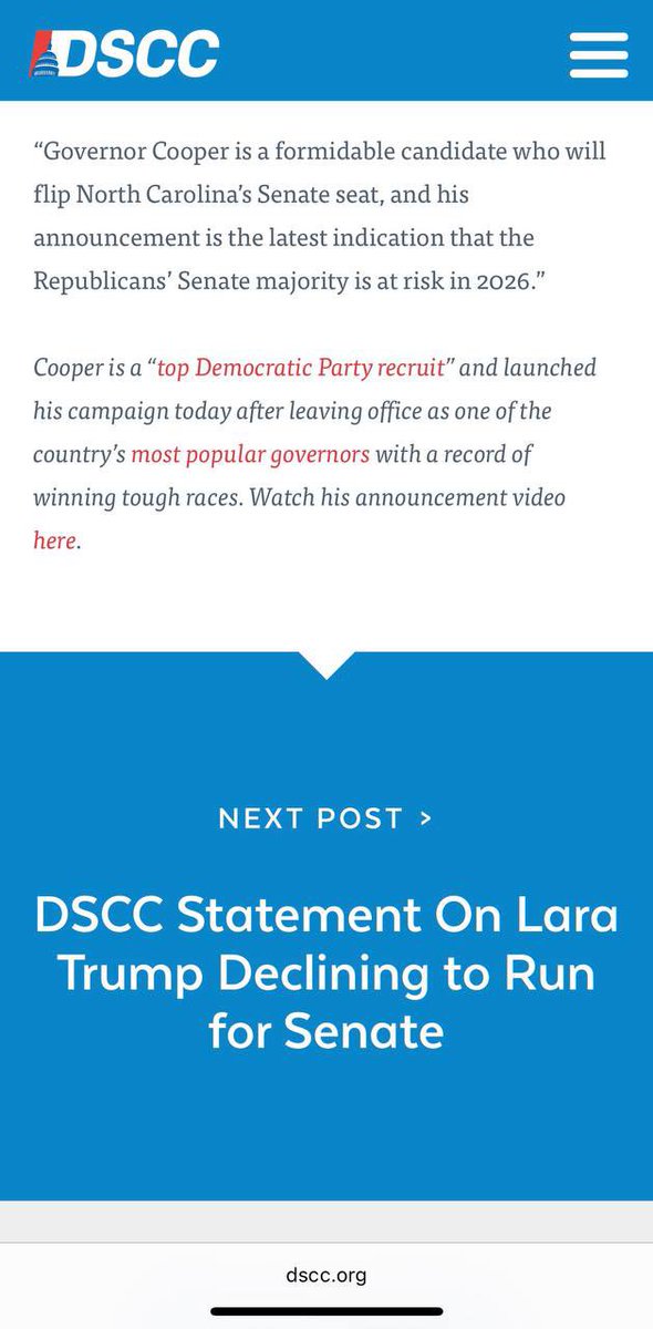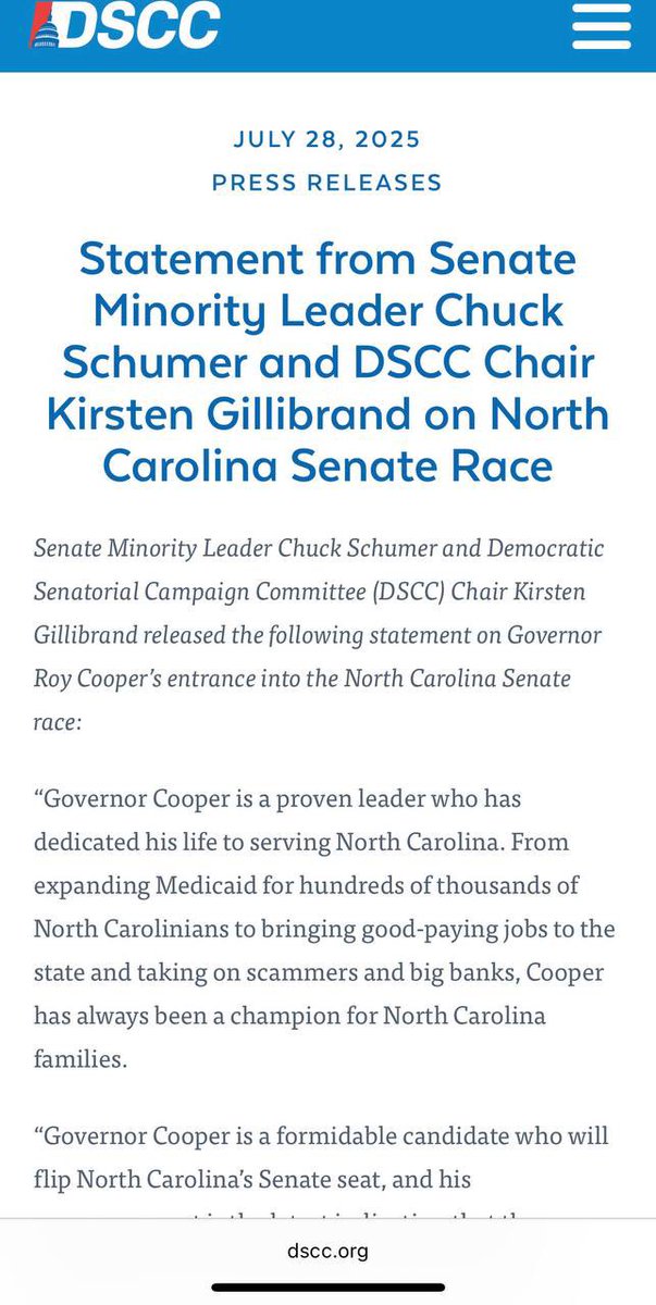 Democrat Senate Minority Leader Chuck Schumer @SenSchumer seems to have a strong liking for Roy Cooper, as he released a statement in July reading, “Governor Cooper is a formidable candidate who will flip North Carolina’s Senate seat, and his announcement is the latest indication that the Republicans’ Senate majority is at risk in 2026.”