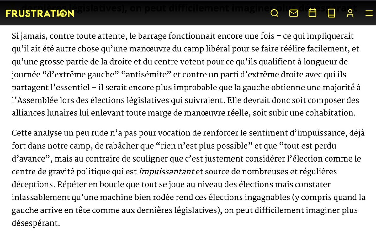Tout cela est bien déprimant. Sauf à continuer de se décentrer du spectacle politique dont l'épicentre est l'élection, et aussi du spectacle de la contestation - qui est son corolaire - pour imaginer de vrais rapports de force et de vraies victoires /13