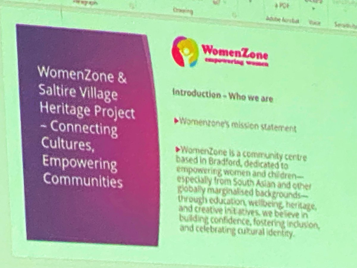 Finally this afternoon is Rubina Khalid co-CEO of WomenZone, a community centre in Bradford East, on engagement with South Asian Communities. Invited to be part of a workshop on the heritage of Saltaire - funded. Women v interested in these kinds of activities she notes.