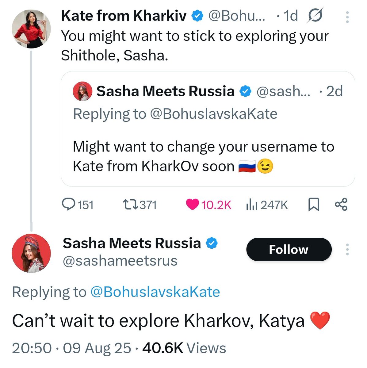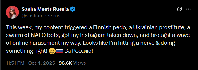 Banned on most platforms, Sasha finally found her home on Elon Musk’s X. She quickly garnered a fervent following — and even started talking politics! Suddenly, the “apolitical” travel vlogger had plenty to say about Ukraine and Ukrainians.