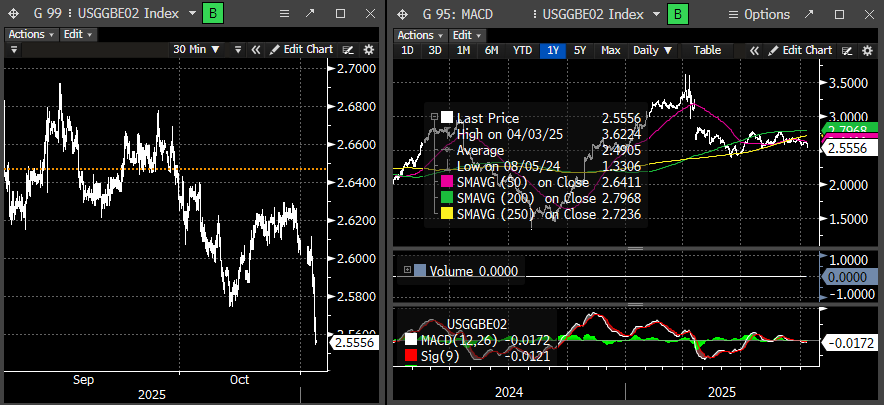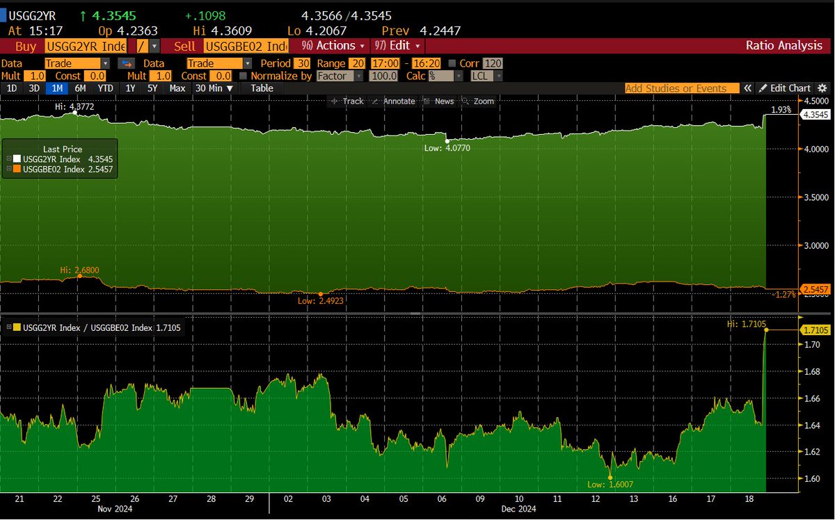 Yesterday was pretty simple- By concentrating on inflation, Powell jawboned the breakeven inflation rates lower (orange line) while nominal rates slightly rose (white line) from overly dovish expectations.
