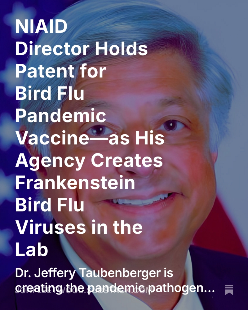 1️⃣ The U.S. National Institute of Allergy and Infectious Diseases (NIAID) is funding the lab creation of deadly, genetically engineered bird-flu viruses—even as its director, Dr. Jeffery Taubenberger, is named as an inventor on the U.S. patent for the vaccine platform designed to counter them.