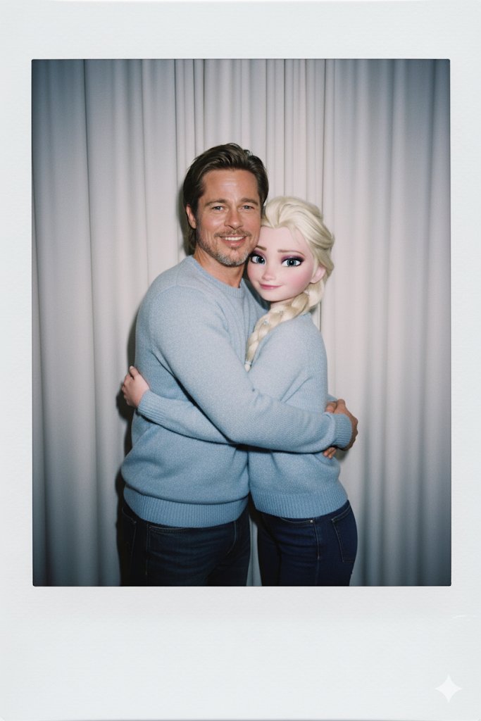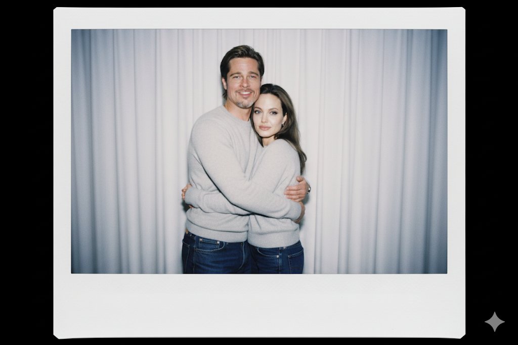 Take a picture with a Polaroid camera. The photo should look like a normal photo, without any clear subject or props. The photo should have a slight blur a a consistent light source. Such as a flash from a dark room, spread throughout the photo. Do not change the faces. Replace the background behind the two people with a white curtain. (With the guy hugging girl) Change outfits with matching couple.