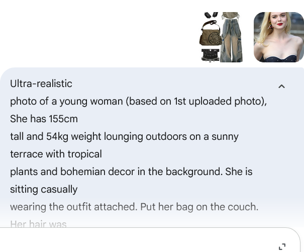 Ultra-realistic photo of a young woman (based on 1st uploaded photo), She has 155cm tall and 54kg weight lounging outdoors on a sunny terrace with tropical plants and bohemian decor in the background. She is sitting casually wearing the outfit attached. Put her bag on the couch. Her hair was pinned out The pose is casual like a model with a soft expression. Natural daylight highlights her skin with a smooth, glowing finish.