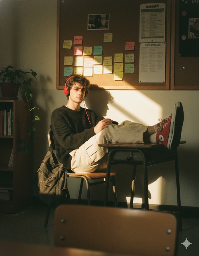 Cinematic portrait of the man in the picture (preserve 100% facial details of this man), vintage classroom. The camera is shot from a distance, with a small section of the chair's back visible in front, as if the photographer was taking the portrait discreetly or in a quiet moment. Soft, golden-yellow lighting reflects from a small window or gap in the right wall, forming diagonal lines of light that fall directly on the man's face, creating a dramatic and emotional contrast. The man sits alone in a chair, his feet resting on the desk, with a relaxed and cool expression, as if lost in thought. He wears an oversized army black Sweater, cream-colored cargo pants, Converse sneak-ers, and red headphones. He has a bag hanging from the chair, but it blends harmoniously with the warm light surrounding him. Behind him is an off-white wall with sticky notes labeled "beingbb" notices duty schedules, and So on, and a photo at the top. There are also a few decorations or furnishings typical of a college classroom. Reinforcing a nostalgic and contemplative feel, like a frozen moment in time. Soft golden hues of light blend with the dark shadows in the room, creating a quiet, warm, and slightly wistful atmosphere, reminiscent of a scene from a Japanese indie film at dusk or early morn-ing. The overall atmosphere suggests an intimate, introspective moment in silence. All image elements are rendered without bokeh, with even sharpness from foreground to background. The visual texture contains noticeable noise and grain, reminiscent of the results of analog 35mm film cameras like the Canon AE-1 or retro digital simulations using the Fujifilm X100V with "Classic Chrome" film simula-tion. Possible camera settings: ISO 1600, f/5.6 aperture, 1/60s shutter speed, with a warm white balance to maintain the natural golden light in the room. The grain effect can come from ISO 400 film or the digital grain feature intentionally activated to add cinematic character and nostalgia.