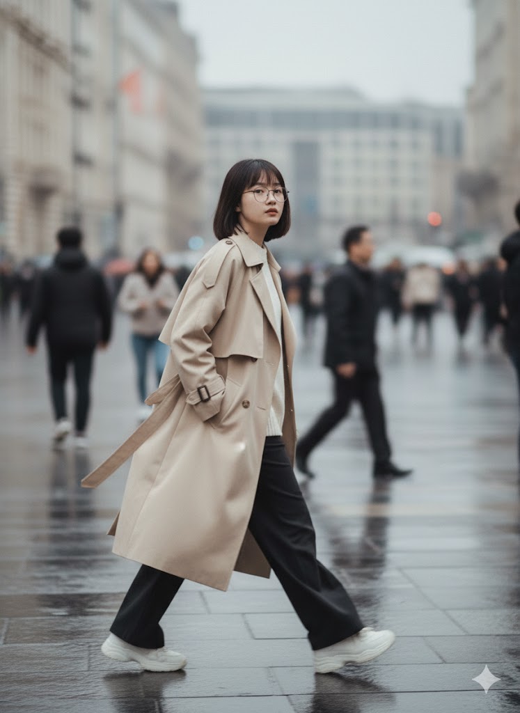 CINEMATIC STREET PHOTOGRAPHY, STYLISH YOUNG WOMAN IN MOTION, URBAN ENVIRONMENT, MOTION BLUR EFFECT. BLURRED PEDESTRIANS PASSING BY, SHALLOW DEPTH OF FIELD, NATURAL OVERCAST LIGHTING, SOFT PASTEL TONES, EDITORIAL FASHION PHOTOGRAPHY, CANDID MOMENT, DYNAMIC MOVEMENT, FILM AESTHETIC, MUTED COLORS