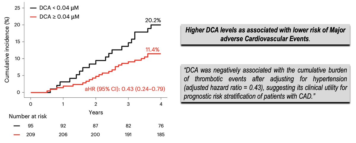 In their four-year follow-up data, higher DCA levels were linked to a lower risk of heart attack, stroke, or death (adjusted hazard ratio = 0.43).
