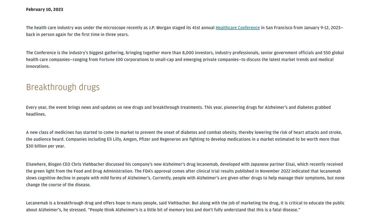 Each year, Chase Bank (weird) holds a private conference for pharma investors, which ultimately sets the tone for the entire industry.