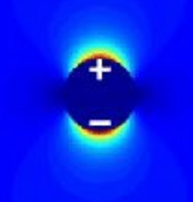 The image is a simulation of a photonic jet, which is a highly localized, high-intensity electromagnetic field that can be generated when a plane wave is scattered by a dielectric sphere or cylinder