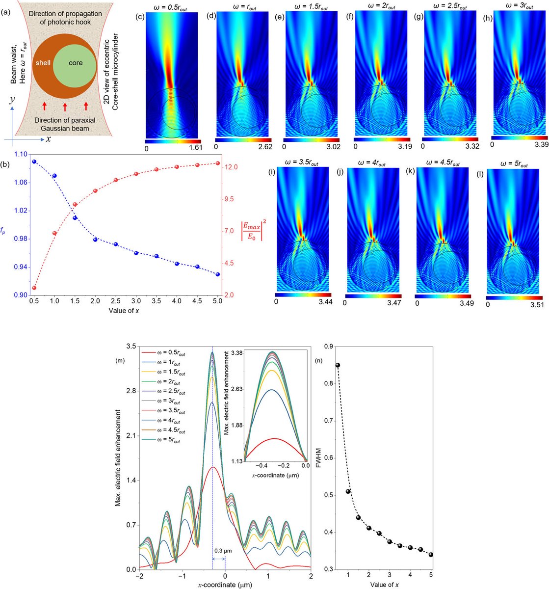 •Electric Field Distribution: Panels (c) through (l) show the maximum electric field distribution of the photonic hook for different values of beam waist,