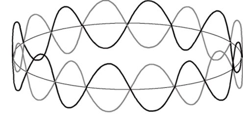 The image represents a standing wave on a circular path, a concept used in physics to visualize wave-particle duality and the quantization of energy.