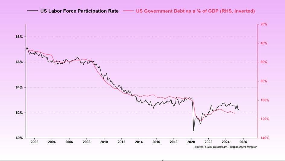 2. Government Debt to GDP ratio is just a function of the working population. It offsets the weak growth and pays for the compunding interests on the debts. This is THE most important chart in macro.