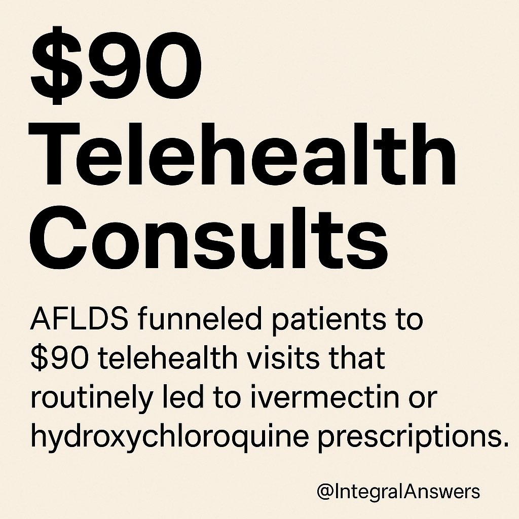 2/ AFLDS promoted $90 telehealth consults through partners like SpeakWithAnMD. Patients were funneled toward prescriptions for ivermectin or hydroxychloroquine, despite no evidence they worked against COVID.
