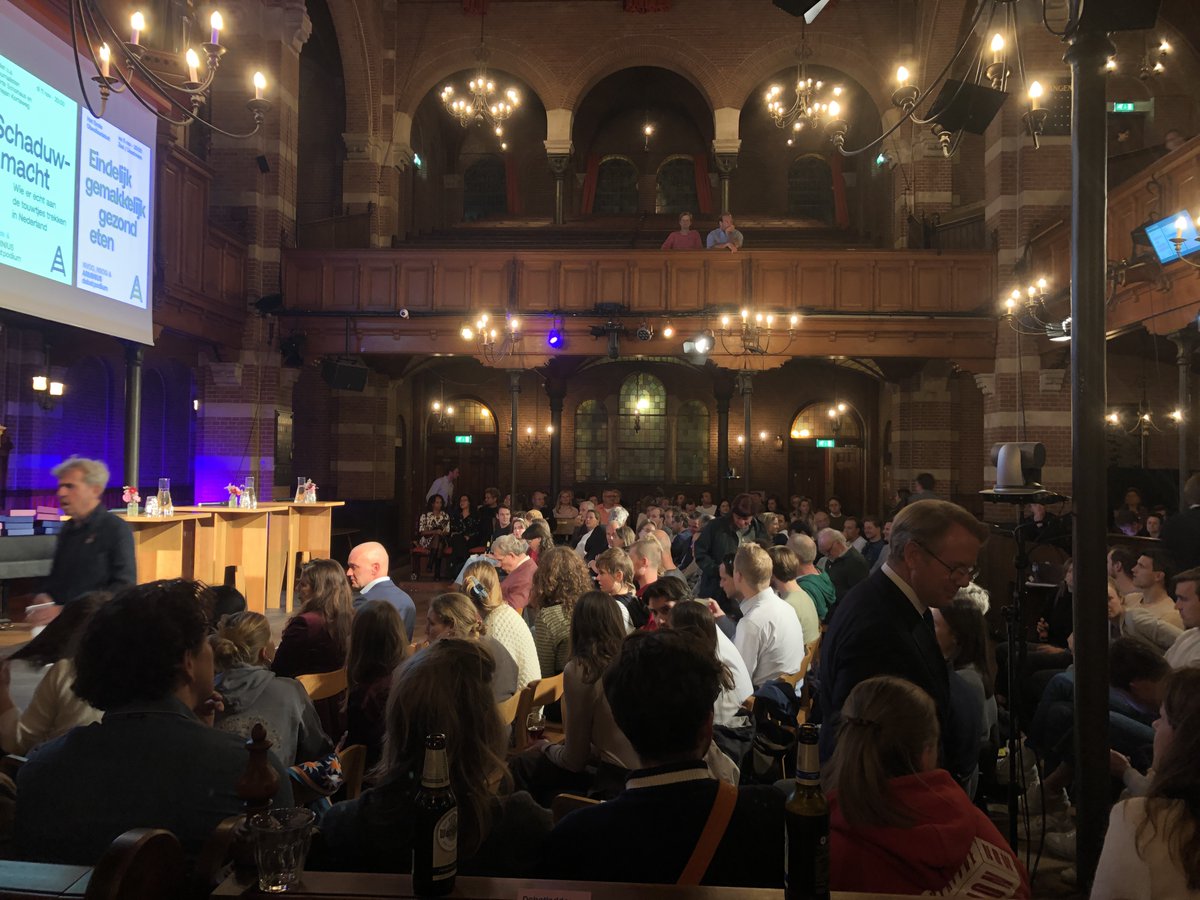Maassen vertelt dat Arminius - het debatcentrum dus - vroeger een kerk was. Maar nu is dit een plek voor de vrije geest. Ondertussen zit de zaal bijna vol. Heel veel jong volk hier.