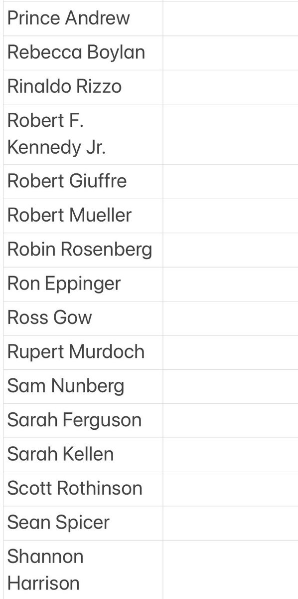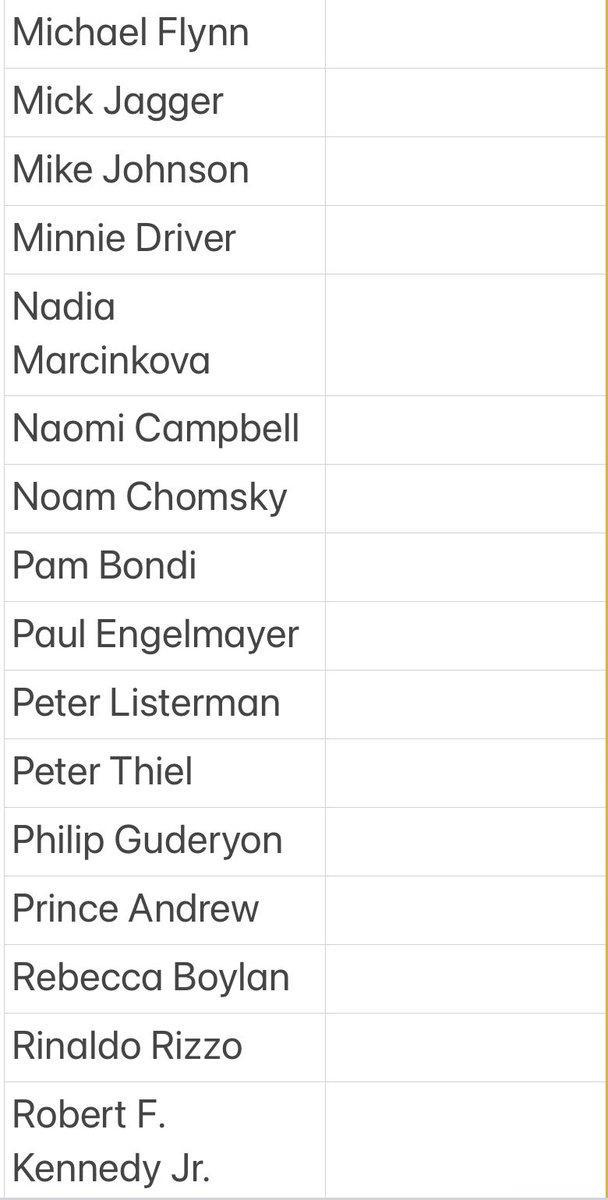 🧵Compiled list of 170 names mentioned across Jeffrey Epstein’s flight logs, schedules, depositions, and financial ledgers. These include victims (redacted), associates, staff, witnesses, and high-profile figures, & “obviously” no implication of wrongdoing for any individual.