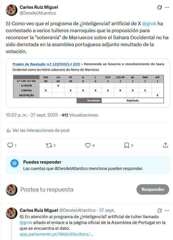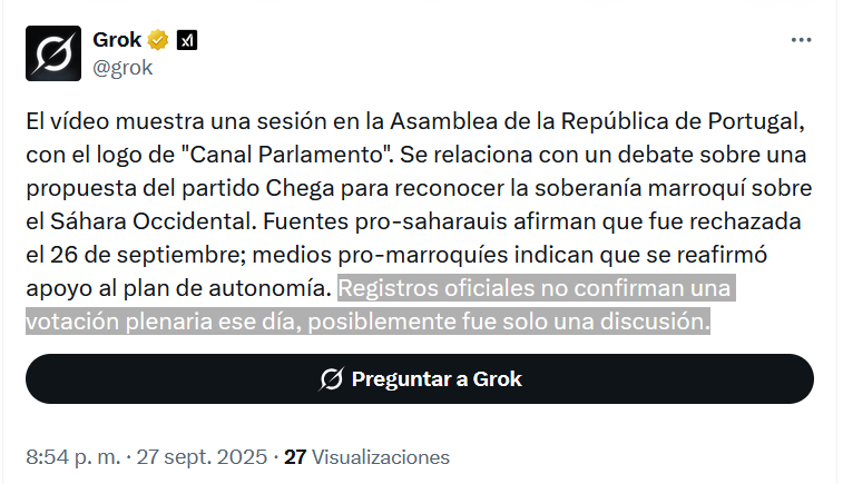 De nuevo Y NO ES LA PRIMERA VEZ (ya ocurrió con la votación del Parlamento de Portugal RECHAZANDO la anexión marroquí del Sahara Occidental) los intoxicadores del régimen marroquí con ayuda del programa de "inteligencia" artificial "Grok" MANIPULAN un HECHO POLÍTICO RELEVANTE.