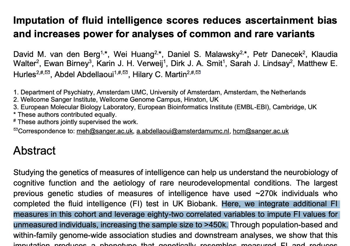 Finally, a recent pre-print imputed higher quality IQ into the full >450k UK Biobank population. Putting *that* data together with the largest available studies of IQ produced a common variant genetic score that explained ... 2.6% of the trait.
