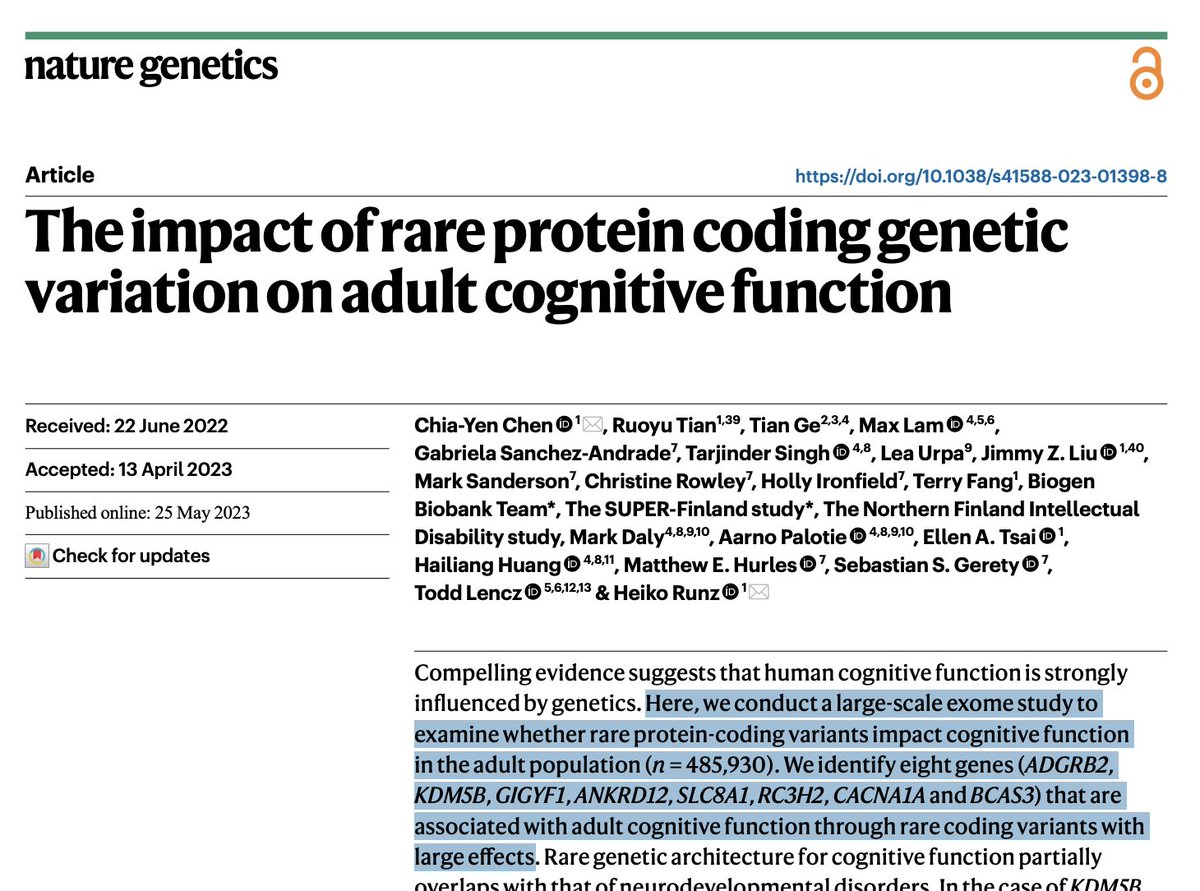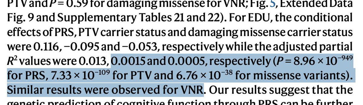 Second, a massive (n=~500k) rare variant study of cognitive function (including a short IQ test) was published in 2023 in one of the most prestigious journals in the field. That study identified a mere eight genes, and the overall variance explained was just 0.15% (that's right).