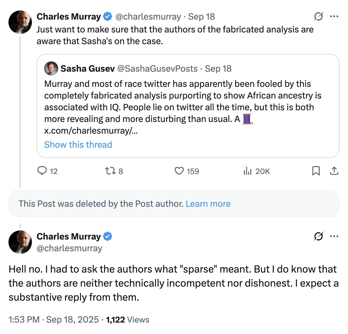 So what's @charlesmurray up to now? He's been laundering fake analyses that he himself doesn't understand from anonymous race bloggers who can't be bothered to write them up (FWIW "substantive reply" did not come). Not with a bang but with a whimper.