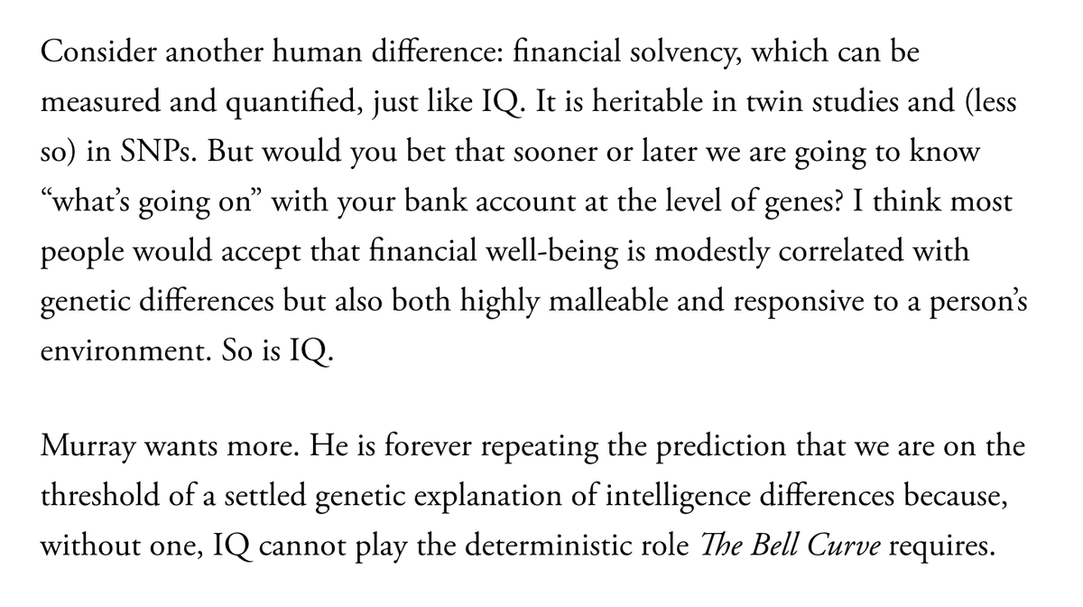 Eric Turkheimer has a good piece about a bet he made with Charles Murray regarding the genetic understanding of IQ (or, really, the lack of it). Murray being so wrong in his prediction should make us question his world model, but it's also worth commenting on his response.