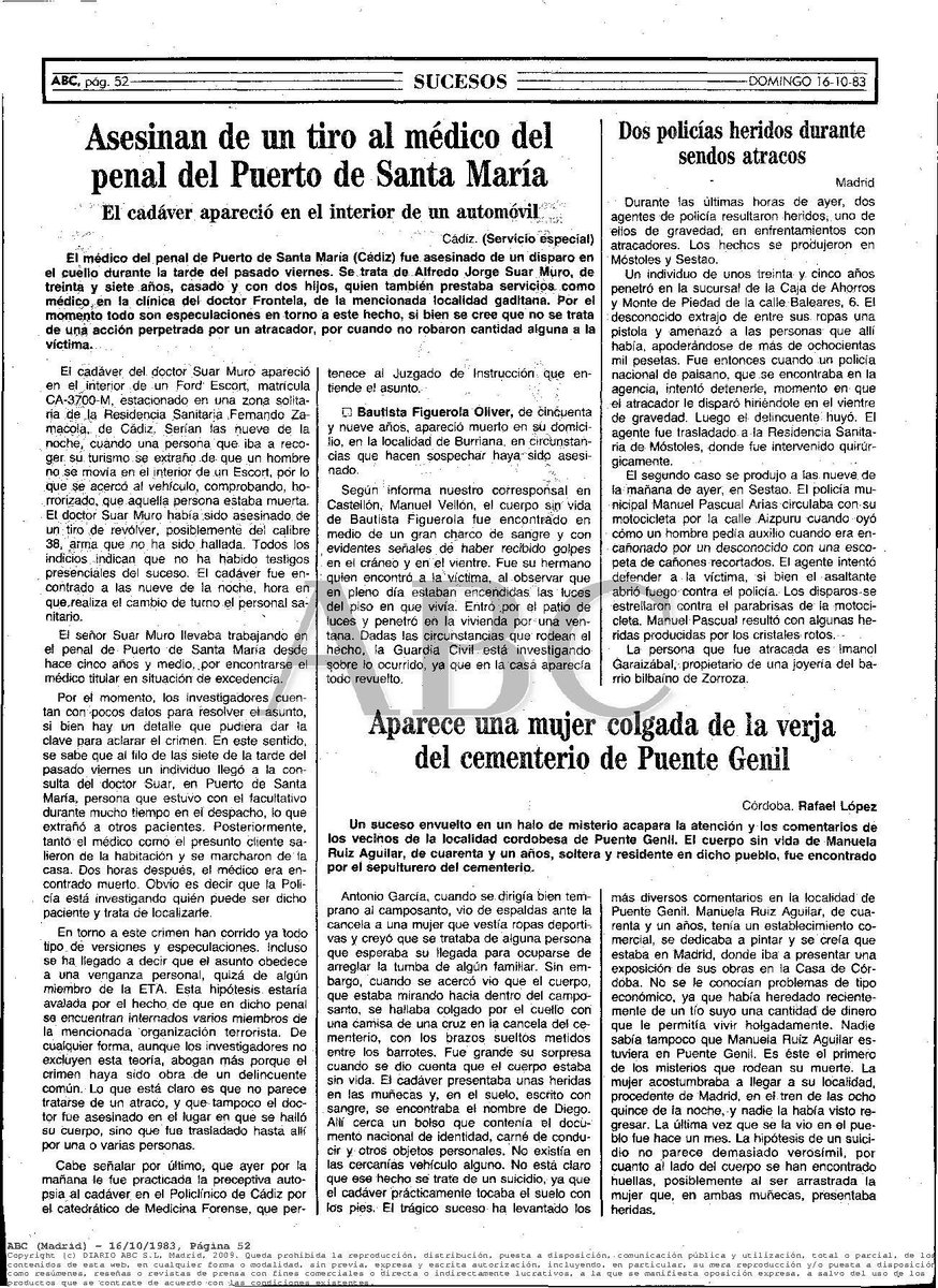 1. Testigos presenciales vieron entrar al doctor Suar Muro en un coche empujado por dos personas, mientras un tercer individuo también se introducía en el vehículo. Horas después descubrieron su cuerpo sentado en el asiento del copiloto con un impacto de bala bajo la oreja.