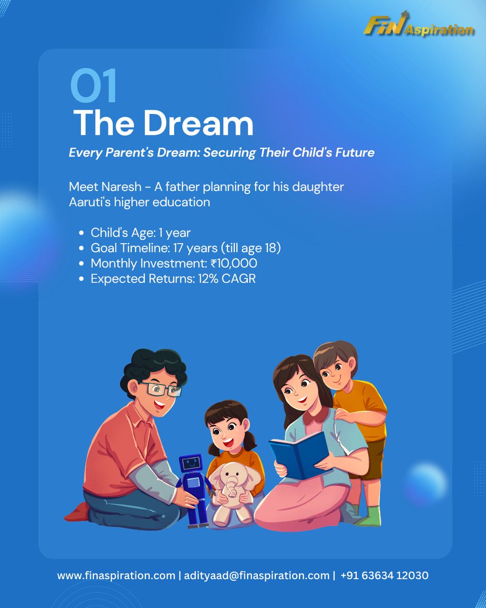 Meet Naresh, a father planning for his daughter Aaruti’s higher education starting when she is just 1 year old. With a 17-year horizon and disciplined SIP of ₹10,000/month, the expected corpus grows significantly. Early planning helps turn aspiration into achievable goals!