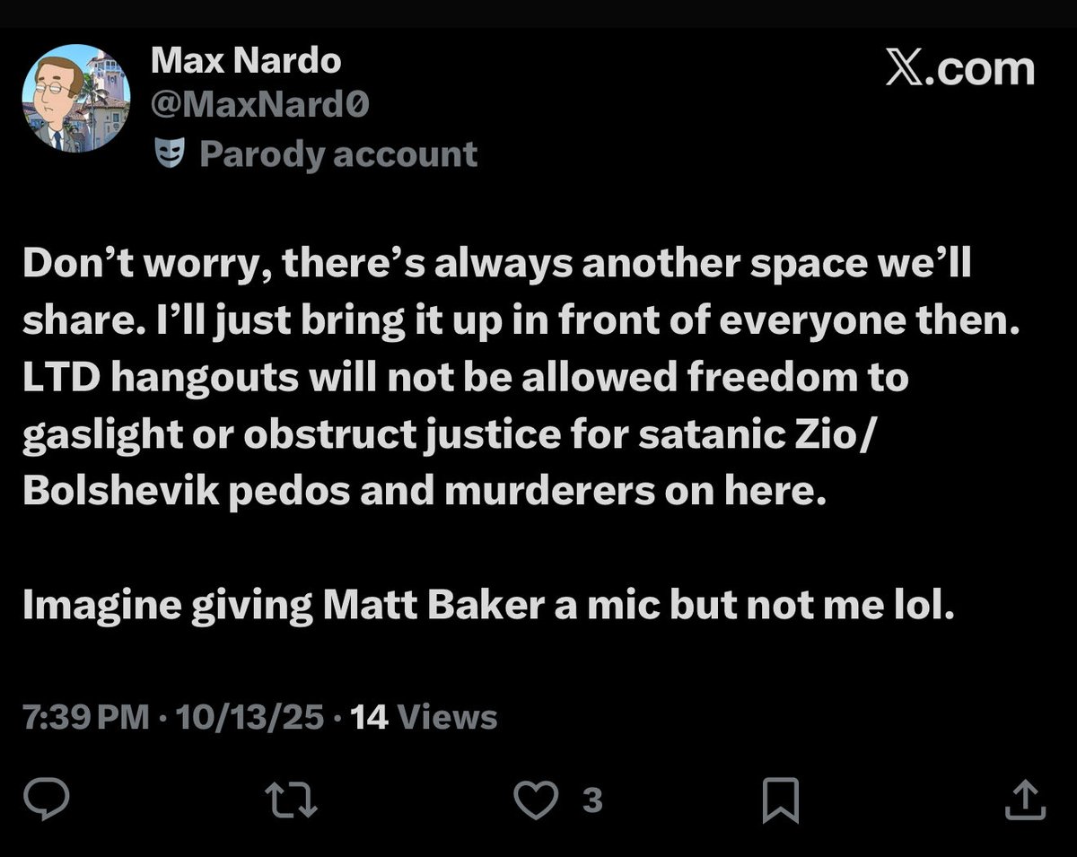 Is that why you and @BasedSamParker ignored my mic request for 45 mins in your “Charlie Kirk | Updates” space today, but gave a mic to Matt Baker and some South African dipshit nobody’s heard of?
