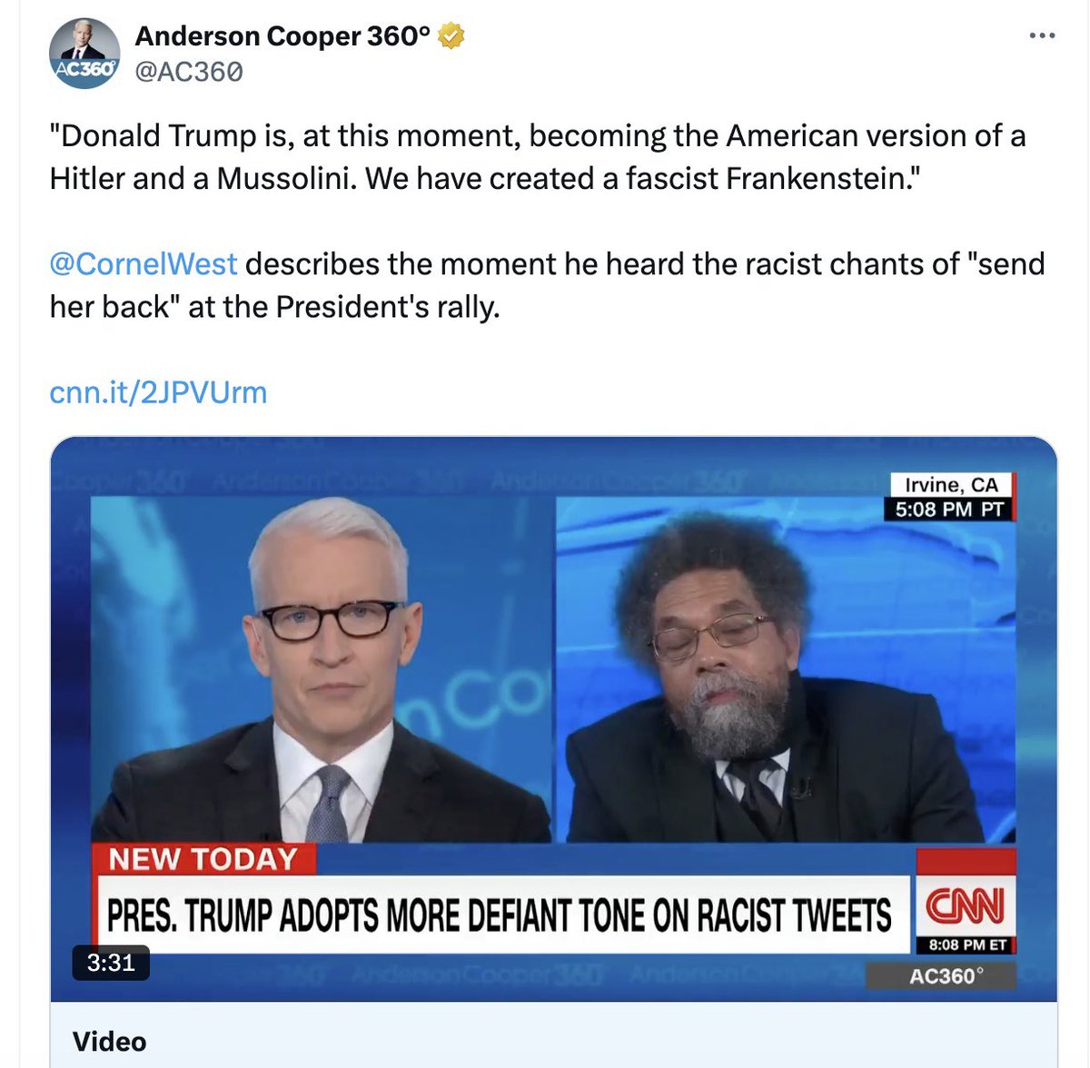 The comment was met with no pushback from @andersoncooper. @AC360 even tweeted the quote out themselves.