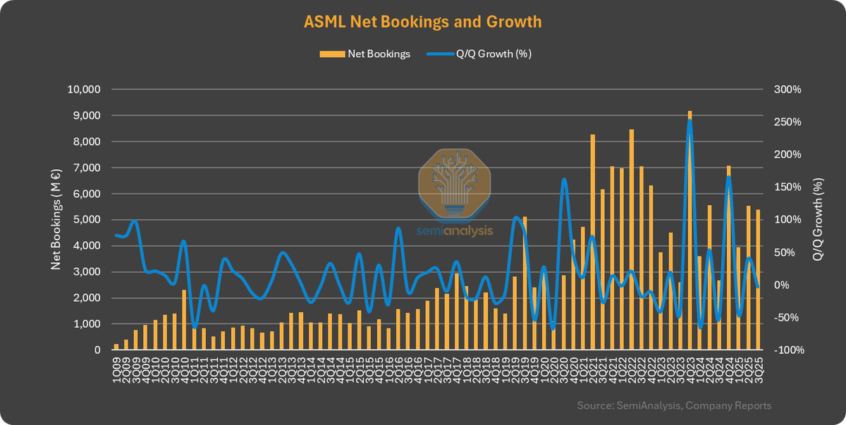 - Net bookings down -3% q/q but up 103% y/y to €5.4B; EUV booking up 57% q/q; DUV down -44%; Memory up 186% q/q