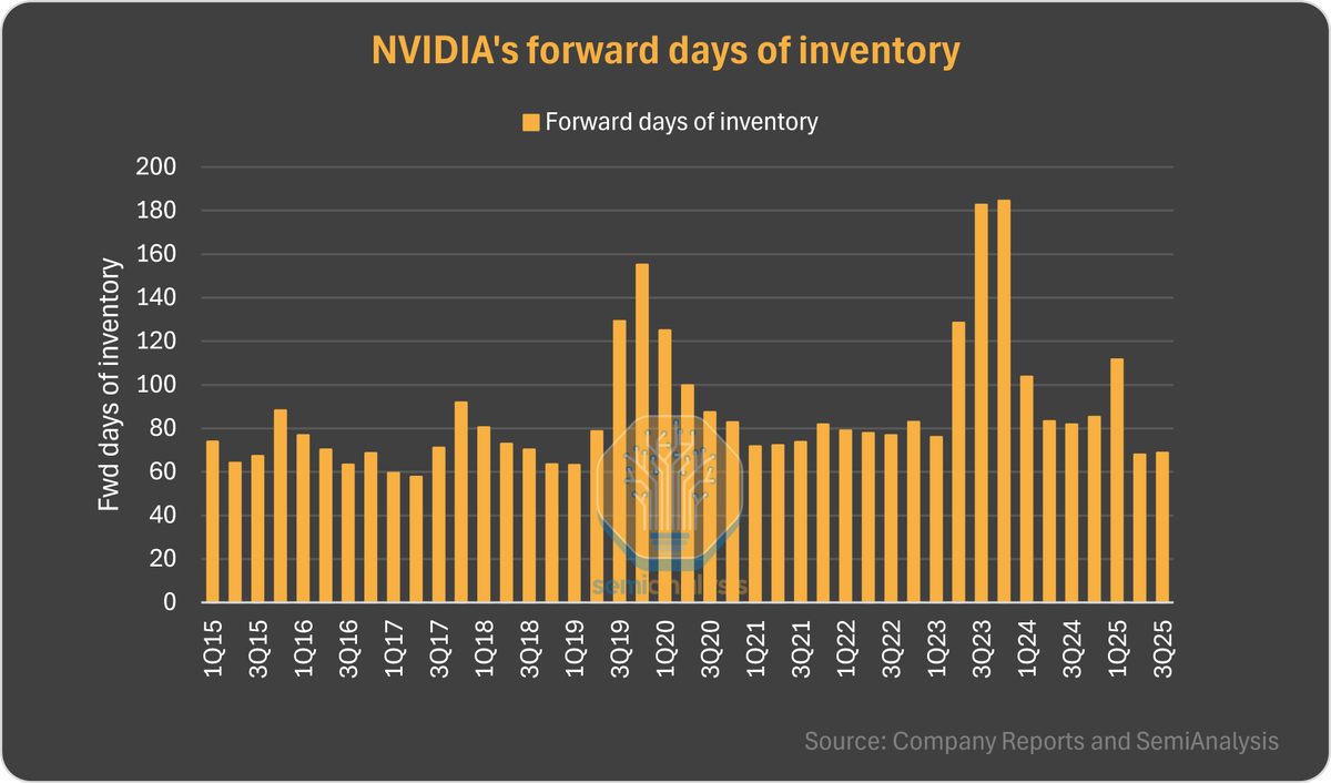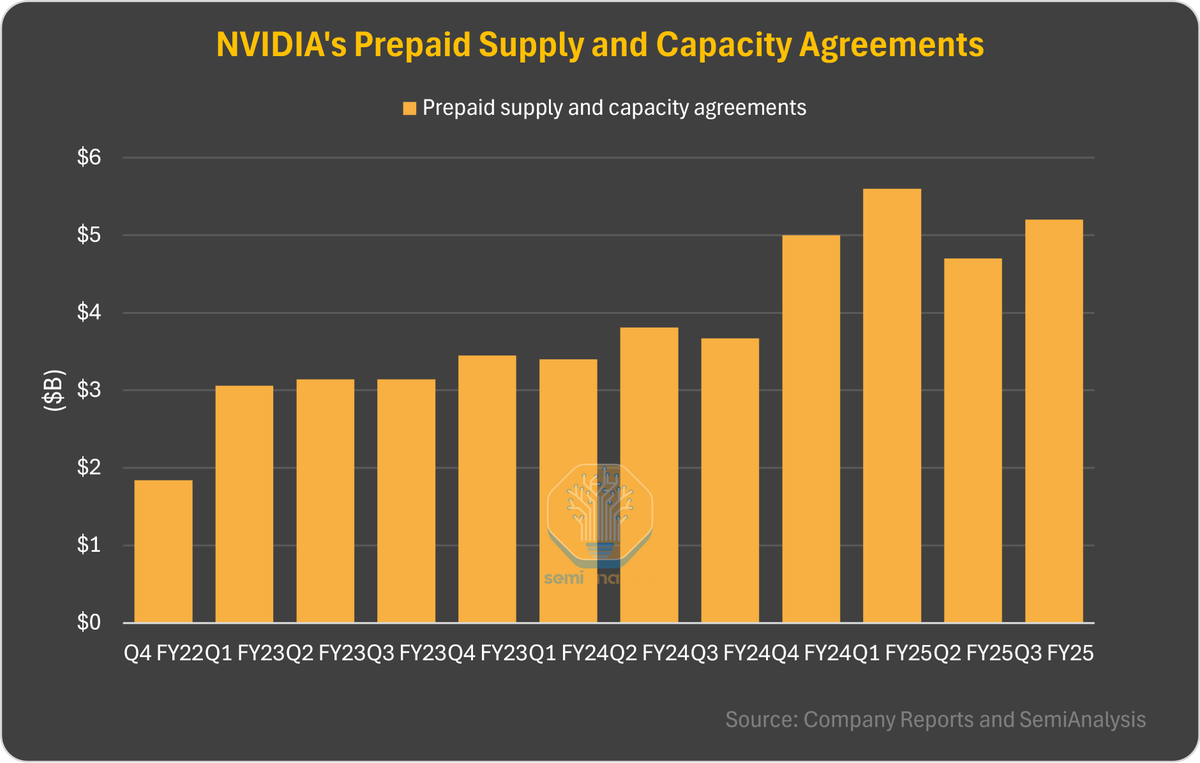NVIDIA's forward days of inventory stand at 69 days (healthy) by the end of 3QFY25, meaning it can flush the current inventory on hand quickly (no surprise). Its outstanding inventory purchase & long-term supply obligations inched up again to $29B. This is where HBM procurement sits. Prepaid supply & capacity agreements stood at $5.2B. Multi-yr cloud service agreements grew 15% q/q to $11.3B.