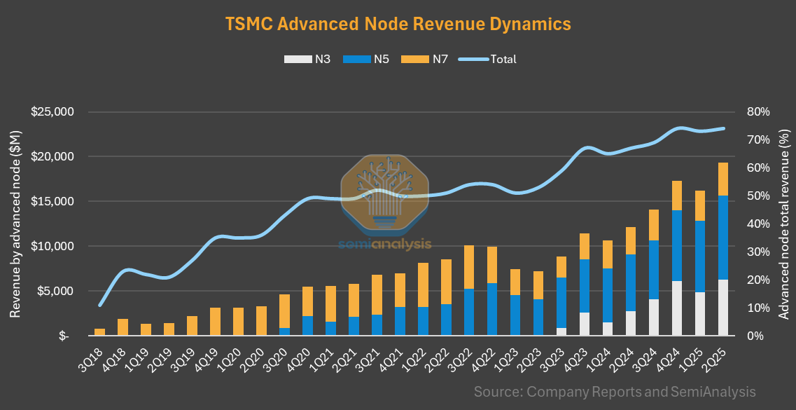 Advanced node revenue (N7 and below) up 19% q/q and 59% y/y to $19.3B. N3: +29% q/q; N5:+18%; N7: +10%. Android drove N3 despite Apple seasonality.