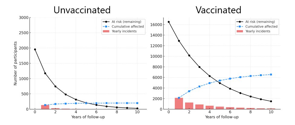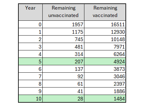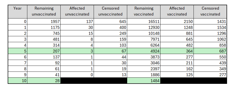 Big numbers in the vaccinated but still over 200 unvaccinated at year 5
