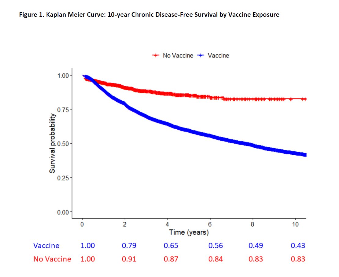 It shows that by the end of the 10 year follow-up, of those that they could still follow up (who stayed in the study) 57% (100-43%) of vaccinated kids had chronic disease (e.g. asthma) and 17% (100-83%) of unvaccinated kids did.