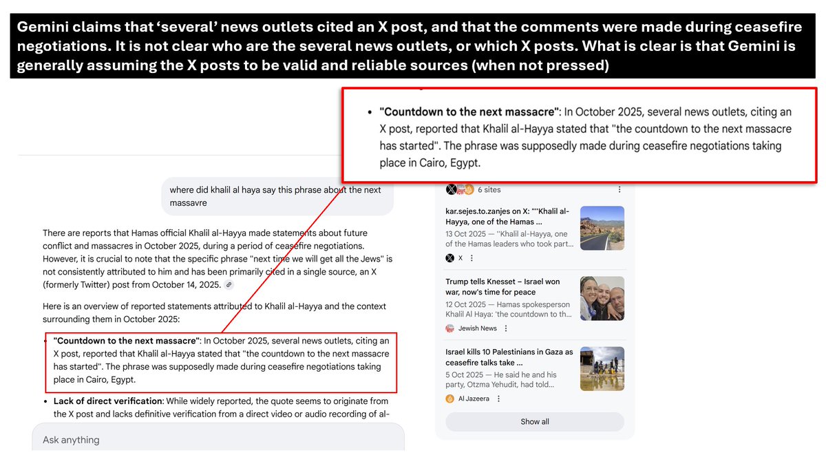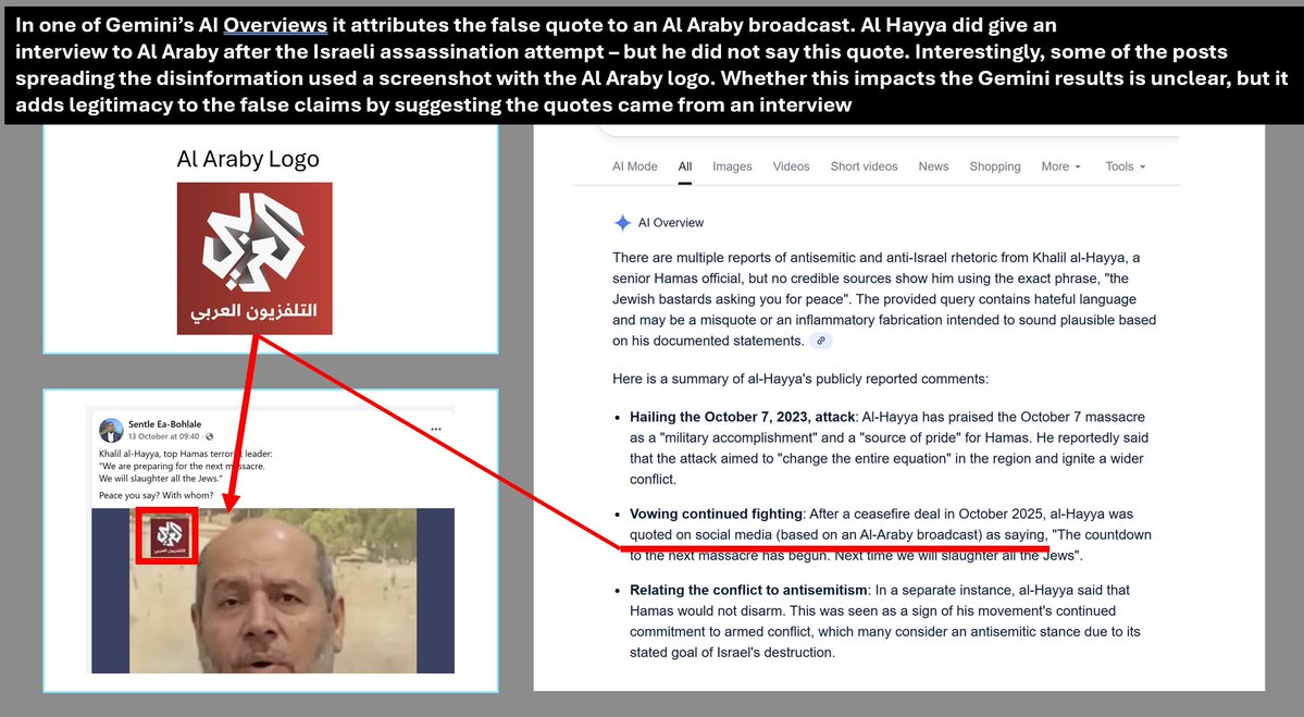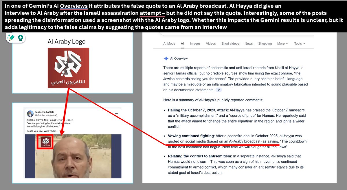 8/ In one of Gemini’s AI Overviews it attributes the false quote to an Al Araby broadcast. Al Hayya did give an interview to Al Araby after the Israeli assassination attempt – but he did not say this quote.