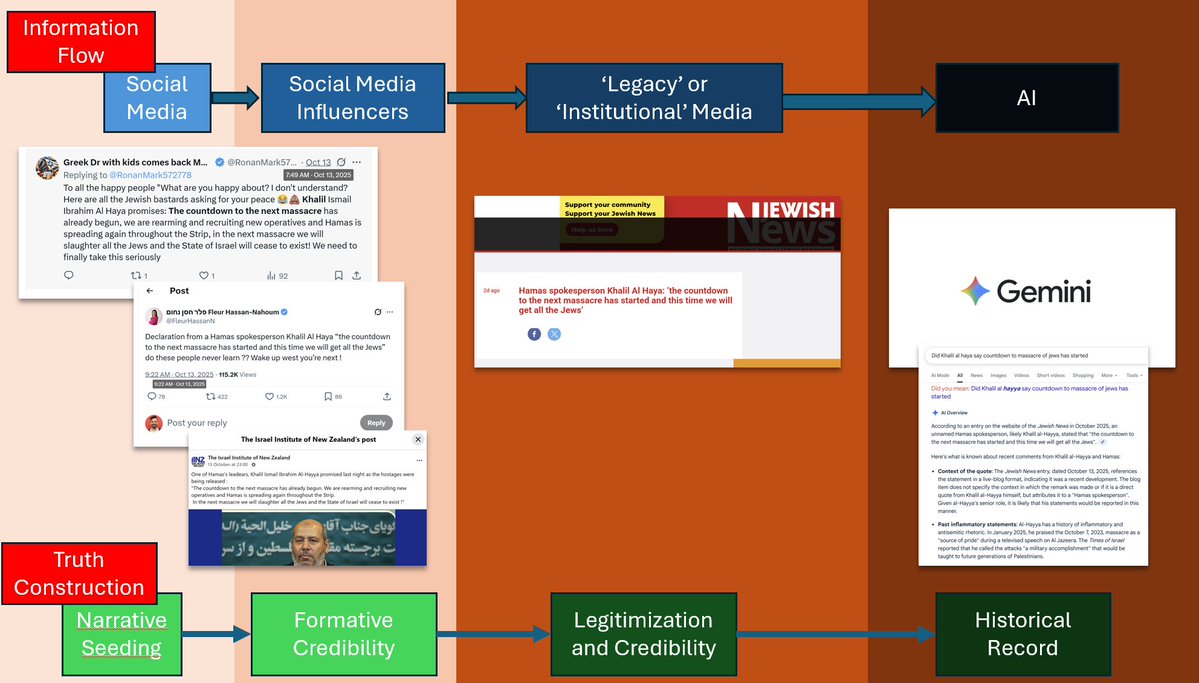 11/ So this is a worrying example of how fake news goes from rumour on social media, to legitimisation via legacy news, to 'truth' in AI. We can understand this process as a chain of credibility building, from unverified narrative seeing on soc media, to 'truth' in an LLM