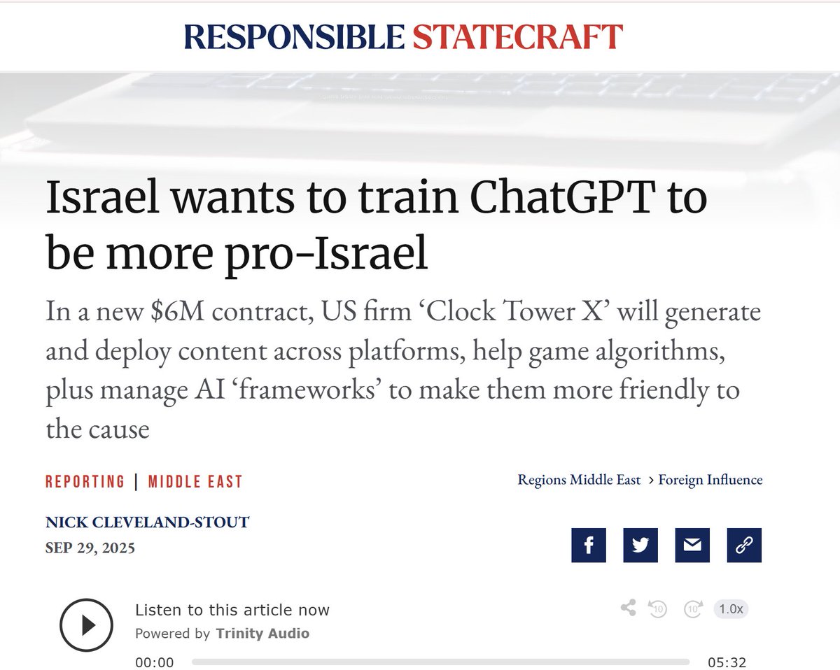 12/ While I am not saying this particular rumour is part of a specific project, we know that this mechanism of knowledge is being targeted. See for example this report by @nick_clevelands. Israel are paying millions for companeis to try and make LLM's more pro-Israel