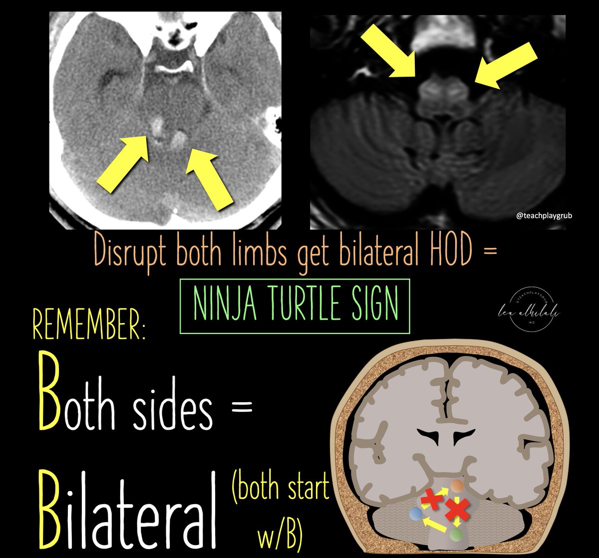 9/Finally, if you interrupt both limbs (ie get both the superior cerebellar peduncle and central tegmental tract as in this example) you will get bilateral hypertrophic olivary degeneration and our famous ninja turtle!!