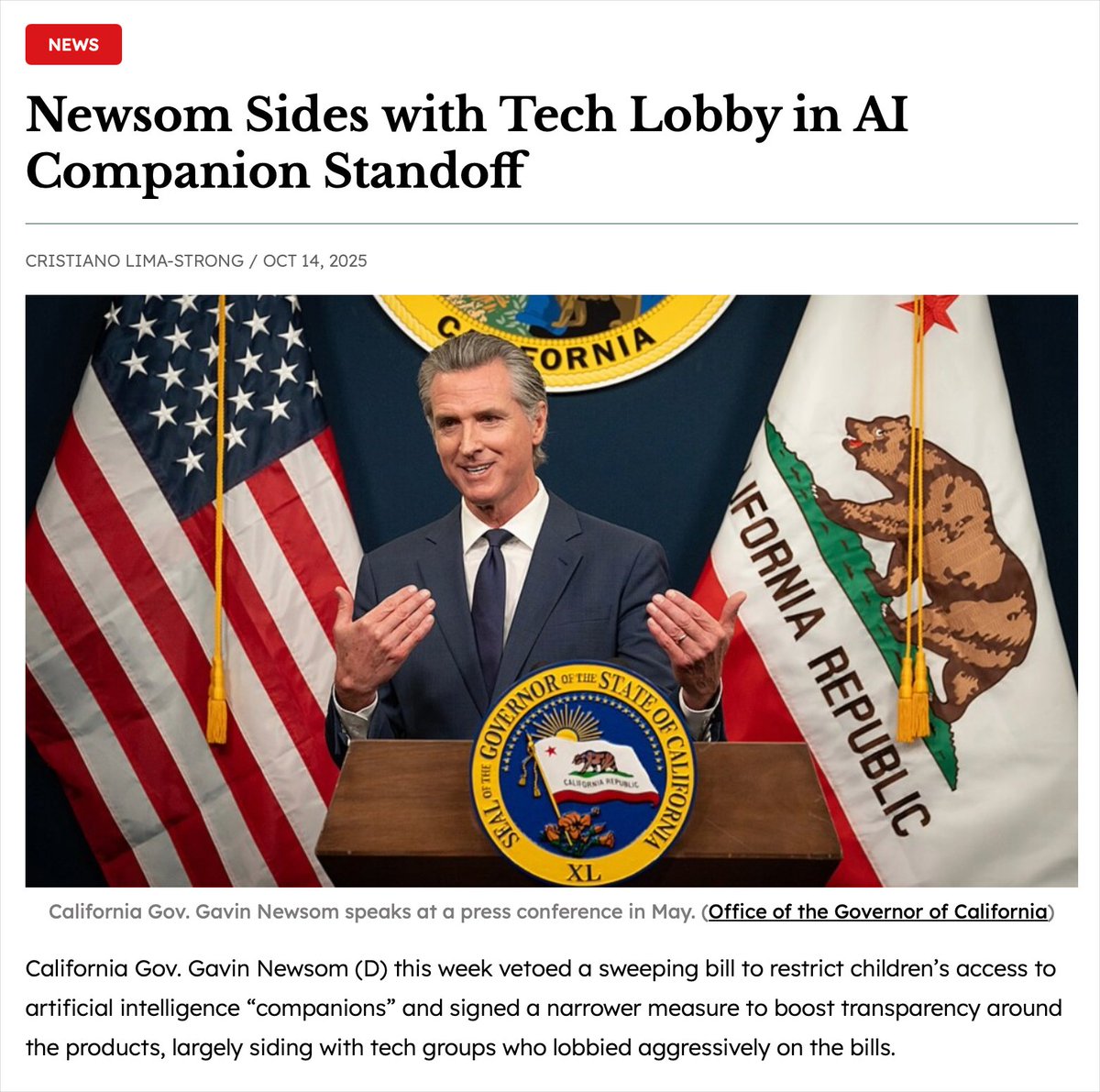October 14, 2025: California Governor Newsom vetoes AB 1064—legislation that would have restricted minors' access to AI companions.