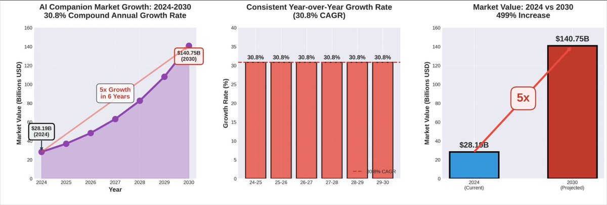 The AI companion market: $28 billion in 2024, projected to hit $141 billion by 2030.