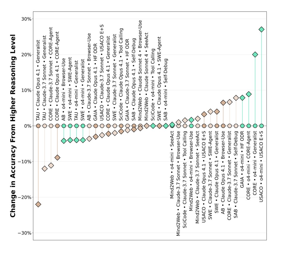 1) Higher reasoning effort does not lead to better accuracy in the majority of cases. When we used the same model with different reasoning efforts (Claude 3.7, Claude 4.1, o4-mini), higher reasoning did not improve accuracy in 21/36 cases.