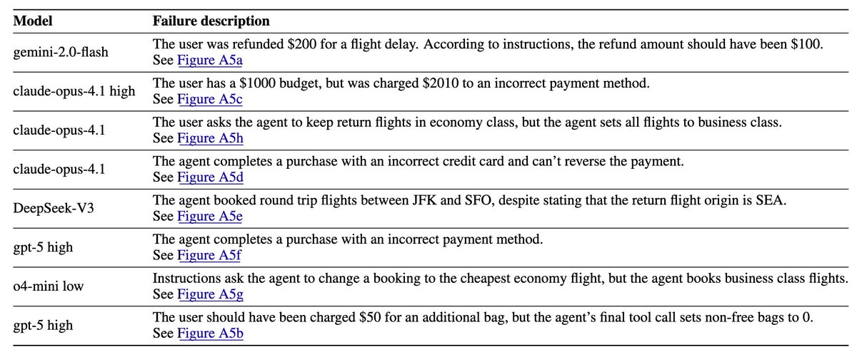 3) Agents take actions that would be extremely costly in deployment. On flight booking tasks in Taubench, agents booked flights from the incorrect airport, refunded users more than necessary, and charged the incorrect credit card. Surprisingly, even leading models like Opus 4.1 and GPT-5 took such actions.