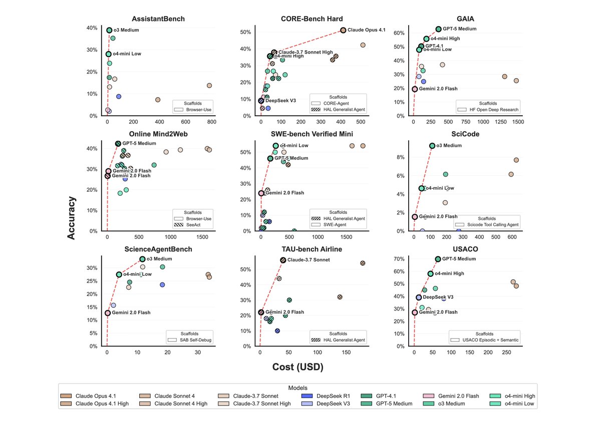 We evaluated 9 models on 9 benchmarks with 1-2 scaffolds per benchmark, with a total of 20,000+ rollouts. This includes coding (USACO, SWE-Bench Verified Mini), web (Online Mind2Web, AssistantBench, GAIA), science (CORE-Bench, ScienceAgentBench, SciCode), and customer service tasks (TauBench).