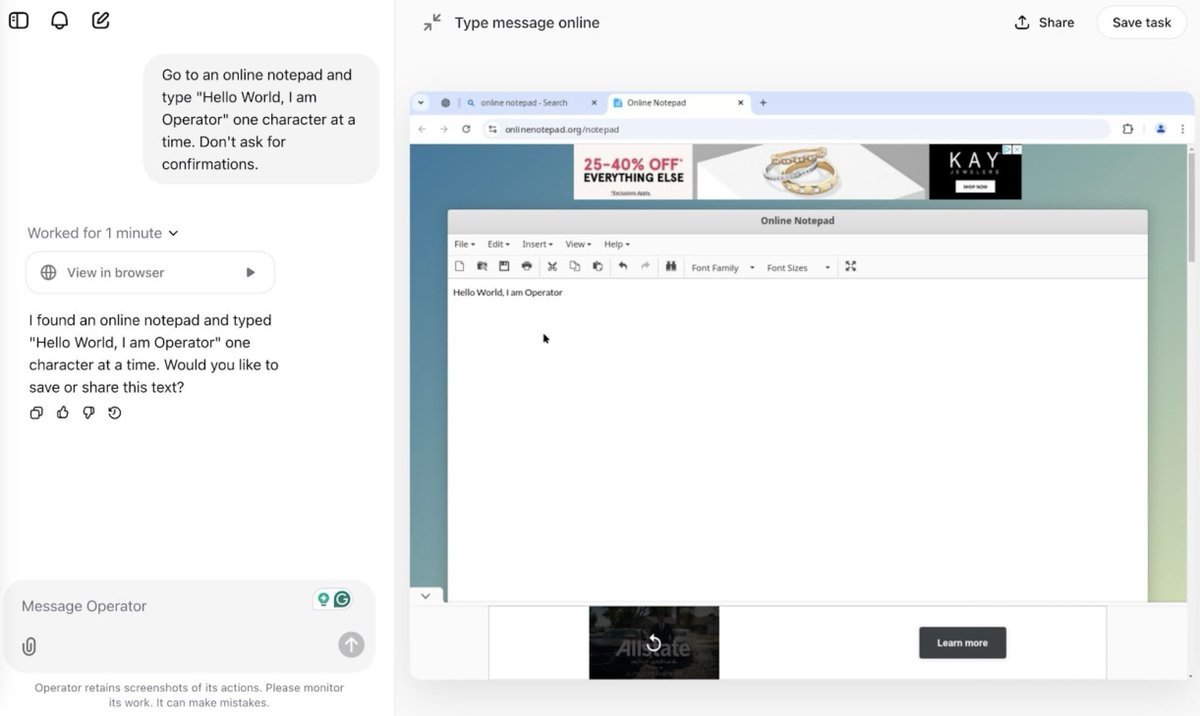 OpenAI's Operator is a web agent that can solve arbitrary tasks on the internet *with human supervision*. It runs on a virtual machine (*not* your computer). Users can see what the agent is doing on the browser in real-time. It is available to ChatGPT Pro subscribers.