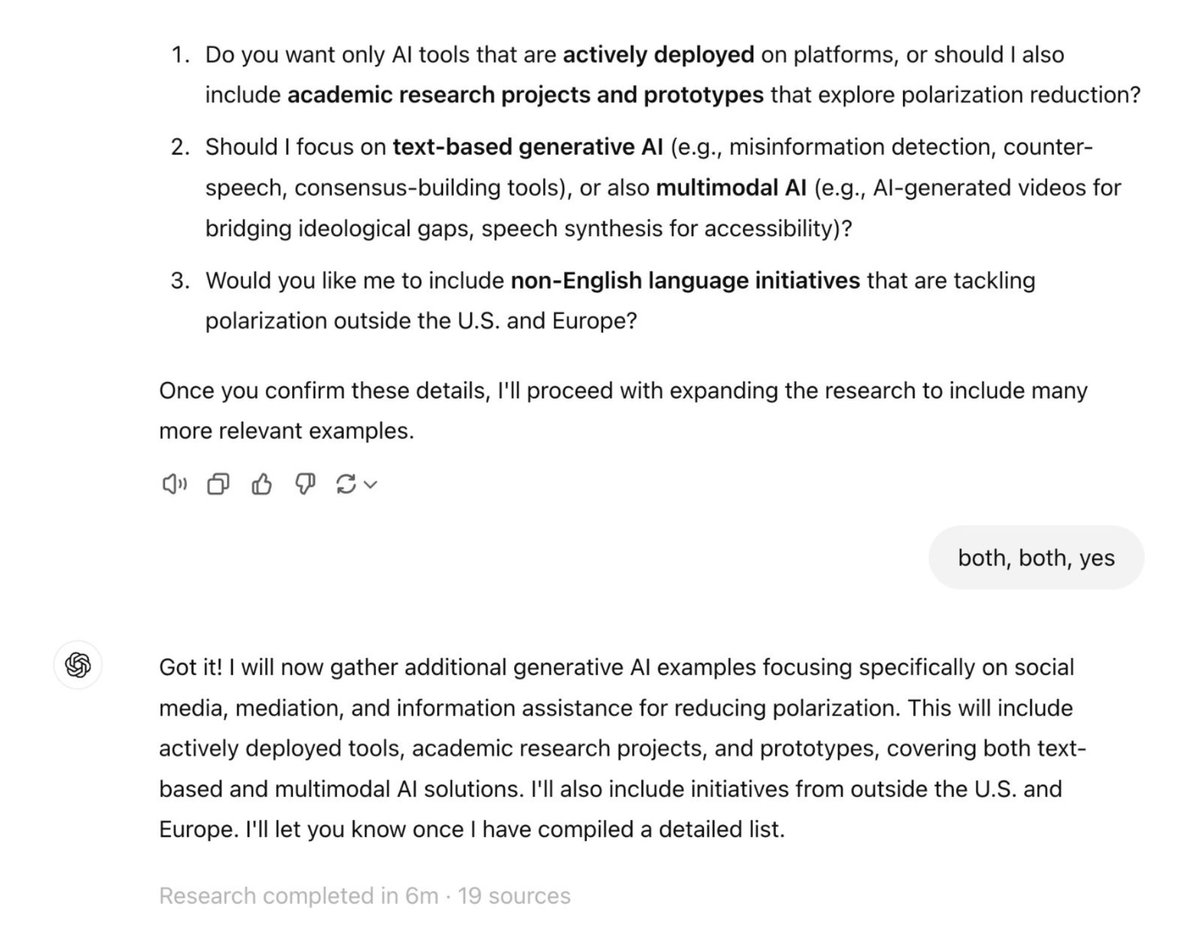 Deep Research browses the internet to create reports. @random_walker and I are writing about pro-social applications of AI for social media. So I used deep research to see if it could supplement the process of surveying the state of such applications and research projects.