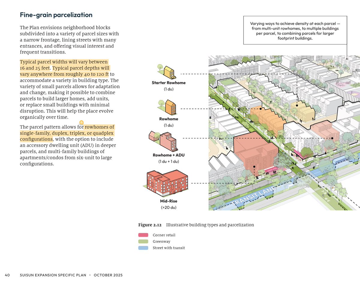 The plan leans into a "homeownership first" model, with lots developed by hundreds of independent builders. It aim create the diversity and interest of an older city's neighborhoods, not the homogeneity of new master-planned communities.