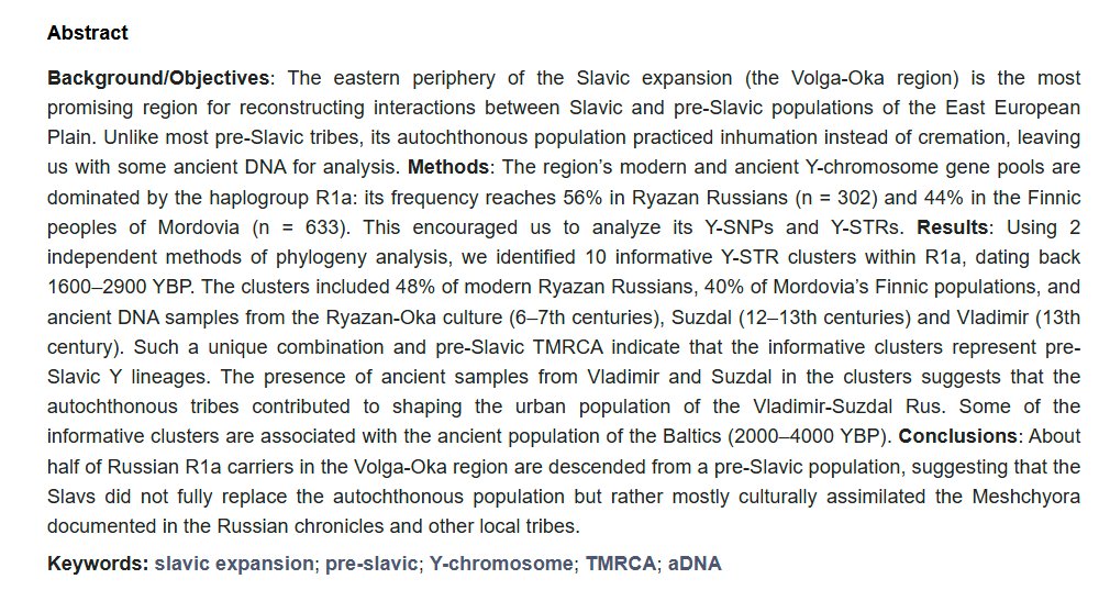 “While most of those young Slavic-associated subclades are part of haplogroup R1a, other haplogroups, including I2a, R1b and E1b, are also represented by specific subclades, which together may constitute an important clue when trying to identify the location of the Proto-Slavic homeland based on ancient DNA data. Additionally, we have identified two specifically Polish subclades (I-Y6343 and R-Z17913, from haplogroups I1a and R1b, respectively) that likely descend from Late Ancient or Early Medieval founders representing the local Pre-Slavic population of the Roman period”