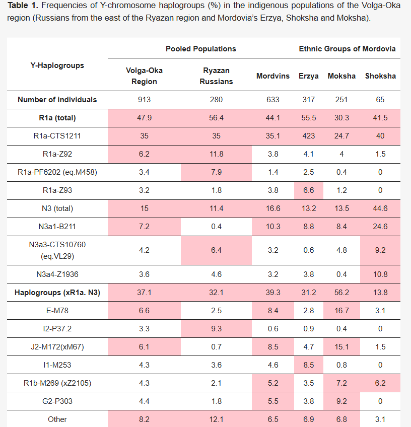 Table 1. Frequencies of Y-chromosome haplogroups (%) in the indigenous populations of the Volga-Oka region (Russians from the east of the Ryazan region and Mordovia’s Erzya, Shoksha and Moksha).