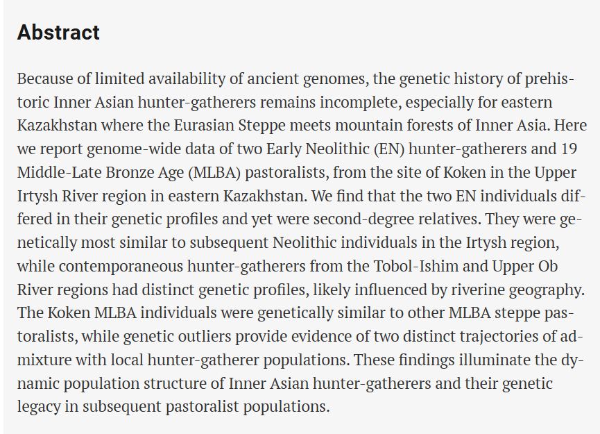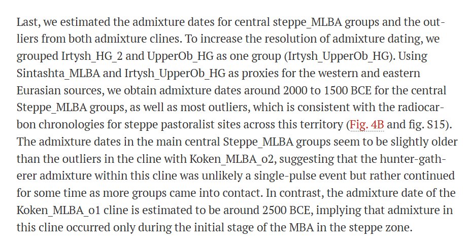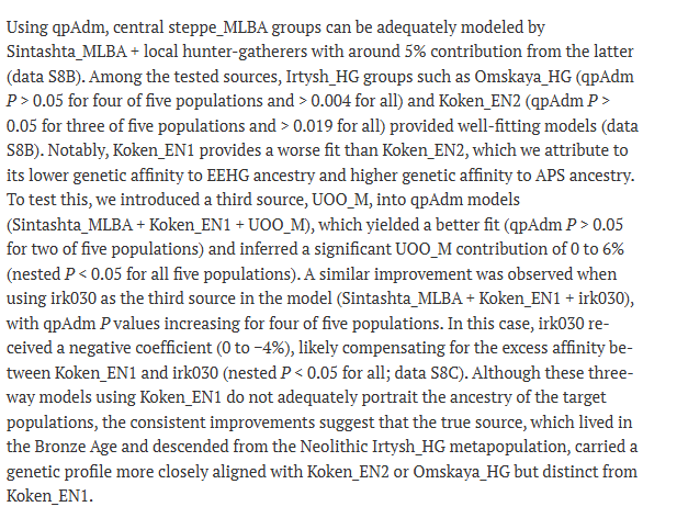 Using qpAdm, central steppe_MLBA groups can be adequately modeled by Sintashta_MLBA + local hunter-gatherers with around 5% contribution from the latter (data S8B).